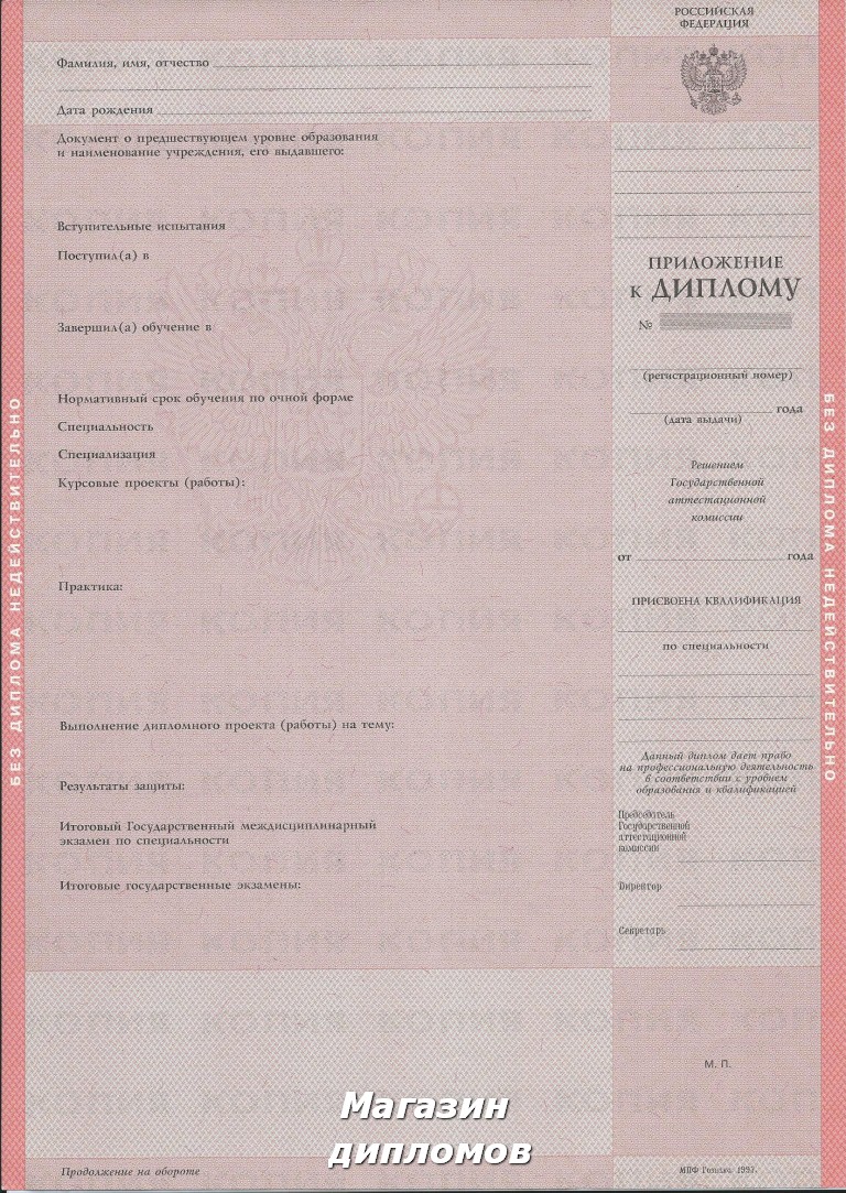 Диплом, это официальный документ, к которому выдвигаются соответствующие требования. Он должен быть заполнен только на бланке государственного образца фабрики ГОЗНАК, на котором в обязательном порядке присутствуют строго установленные средства защиты от подделок: водяные знаки, микрошрифт, светящиеся при ультрафиолете волокна и индивидуальный номер.